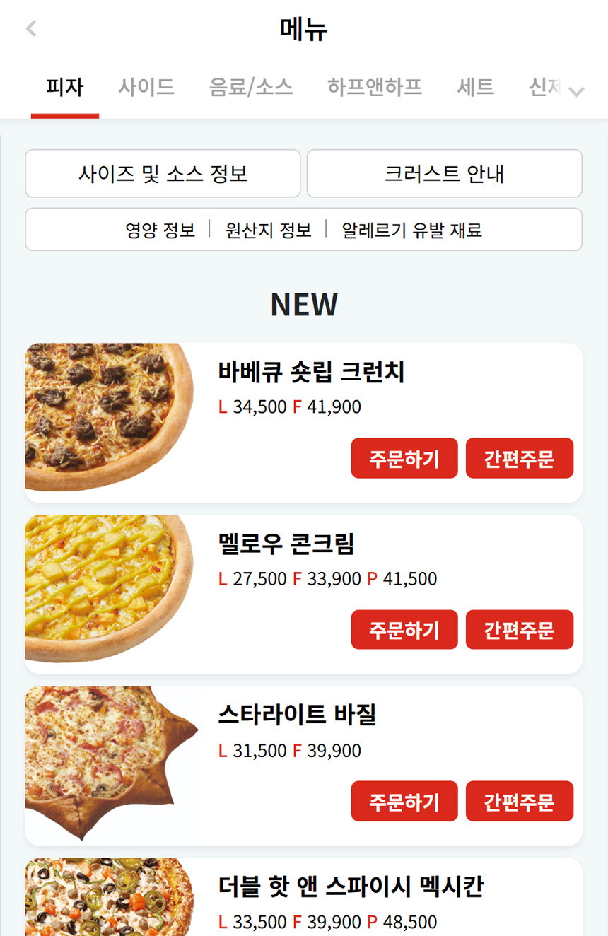 • 로그인 후 메뉴, 라지 사이즈 이상 피자, 콜라 1,25L
