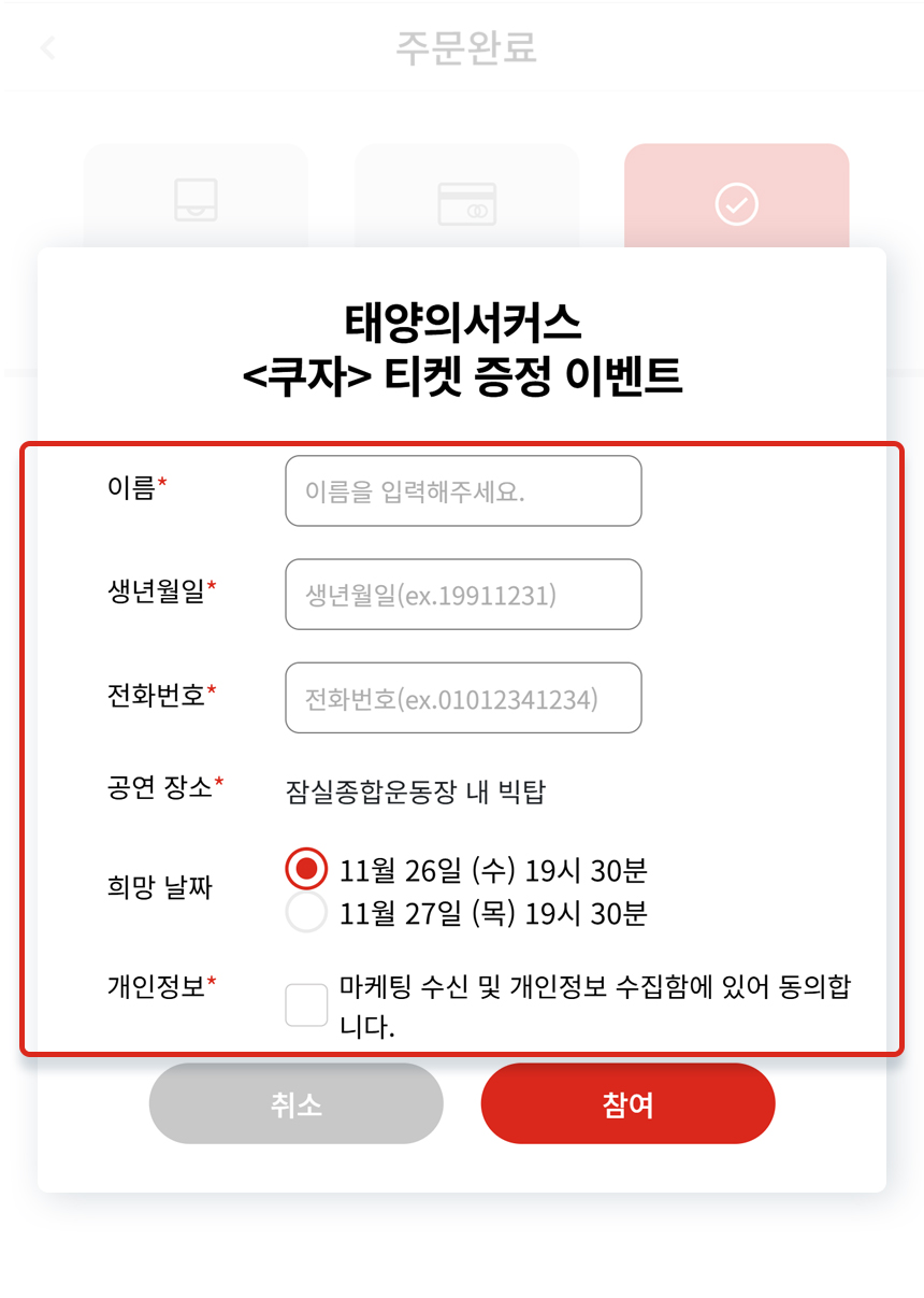 • 제공항목 입력 후 참여 버튼 클릭 시 이벤트 응모 완료