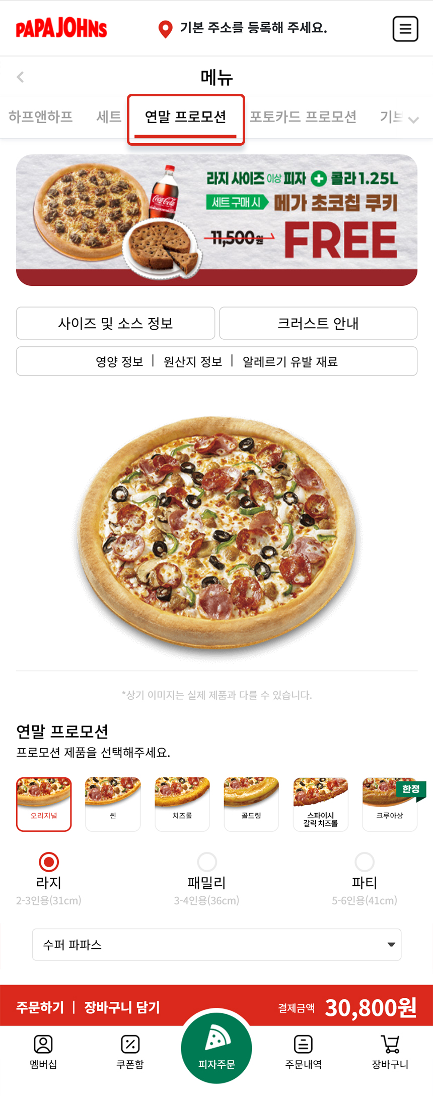 파파존스 피자는 귀하의 정보를 수시 저장하고 찾아내는 ‘쿠키(cookie)’를 사용합니다. 단, 귀하의 정보를 쿠키에 저장하지 않습니다.쿠키란 파파존스 피자의 웹사이트를 운영하는데 이용되는 서버가 귀하의 브라우저(인터넷 익스플로러, 넷스케이프 등)에 보내는 아주 작은 텍스트 파일로서 귀하의 컴퓨터 하드디스크에 저장됩니다. 또한 귀하께서는 쿠키에 대한 선택권이 있습니다. 웹브라우저 상단의 도구 → 인터넷옵션 탭(option tab)에서 모든 쿠키를 다 받아들이거나, 쿠키가 설치될 때 통지를 보내도록 하거나, 아니면 모든 쿠키를 거부할 수 있는 선택권을 가질 수 있습니다. 다만, 쿠키를 거부할 경우에는 로그인이 필요한 서비스를 이용할 수 없습니다.쿠키는 PC의 로그아웃 시에 자동으로 PC에 저장되지 않고 삭제되도록 되어 있으므로 공공장소나 타인이 사용할 수 있는 PC를 사용하실 경우에는 로그인 후 서비스 이용이 끝나시면 반드시 로그아웃을 해주시기 바랍니다.
